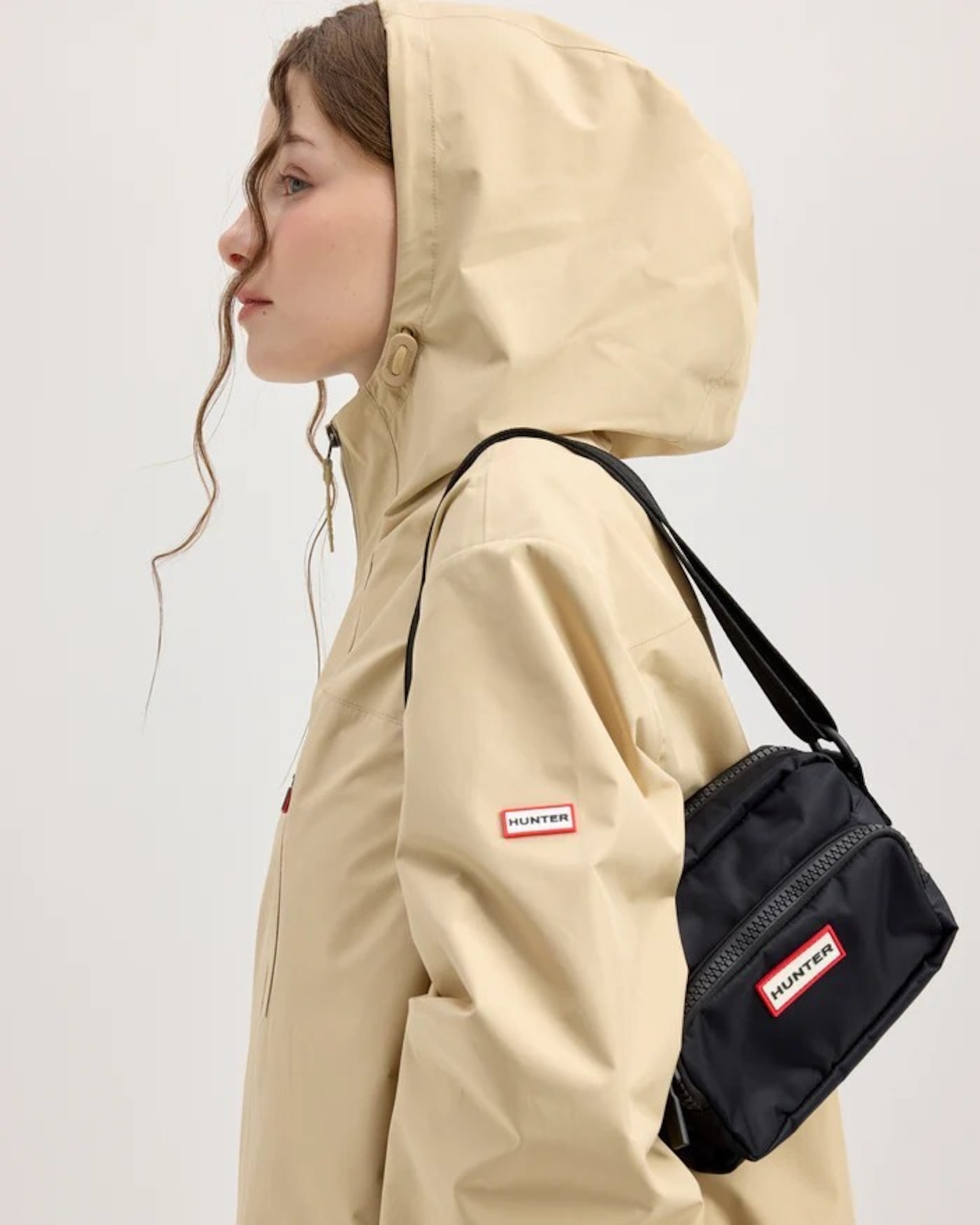 本体は耐水性のリサイクルナイロン、裏地にはリサイクルポリエステルのライニングを使用しています。ストラップは、長さ調節が可能で、クリップ部分にはハンターのシグネチャーがエンボス加工で施されています。フロント部分には小物収納に便利なミニポケットがあります。