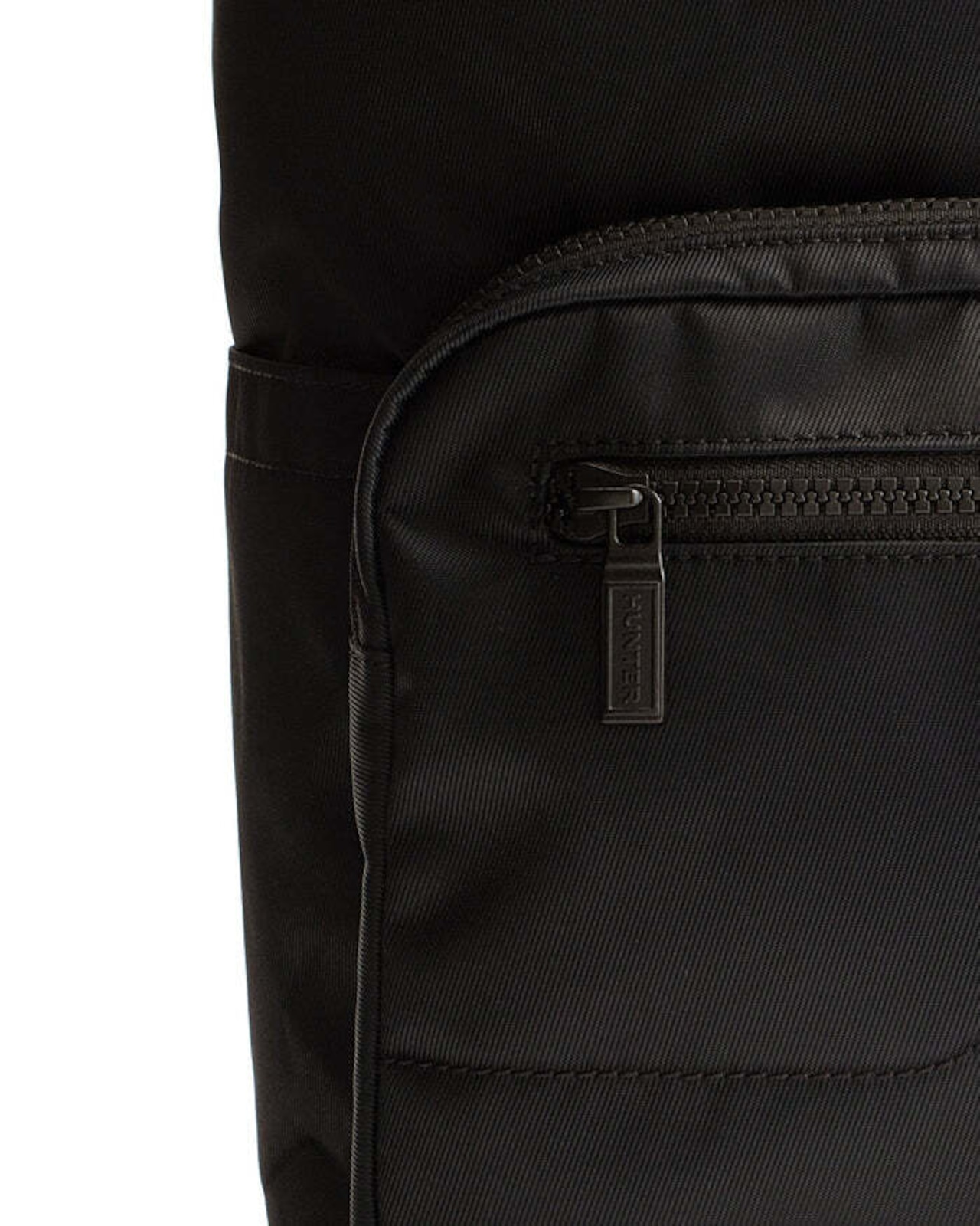 本体は耐水性のリサイクルナイロン、裏地にはリサイクルポリエステルのライニングを使用しています。ストラップは、長さ調節が可能で、クリップ部分にはハンターのシグネチャーがエンボス加工で施されています。フロント部分には小物収納に便利なミニポケットがあります。