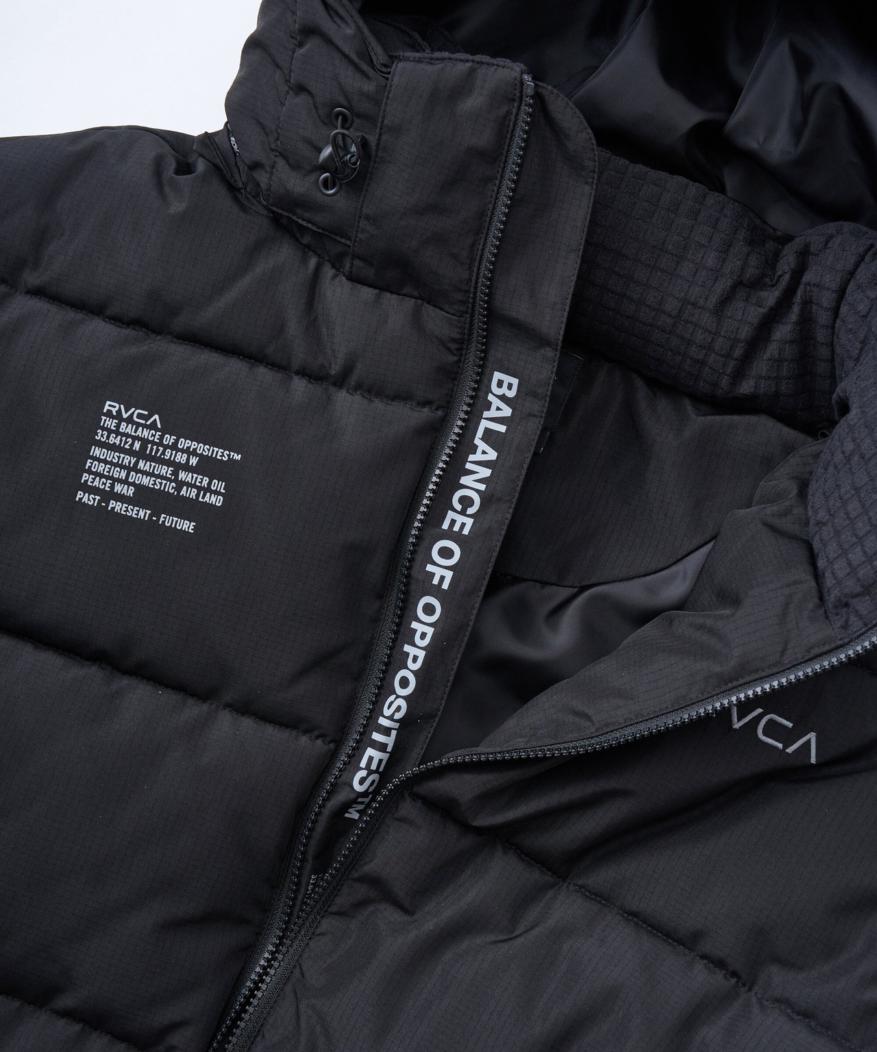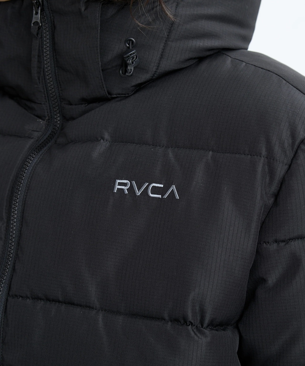 環境への負荷が少ない中綿をたっぷり使用し防寒性抜群。また、ミニリップストップ素材を使用し撥水性も持たせました。バックとフードにはアイコニックなRVCAロゴのプリントを配置。着こなしやすさと動きやすさを兼ね備えた2WAYフロントジッパー仕様。